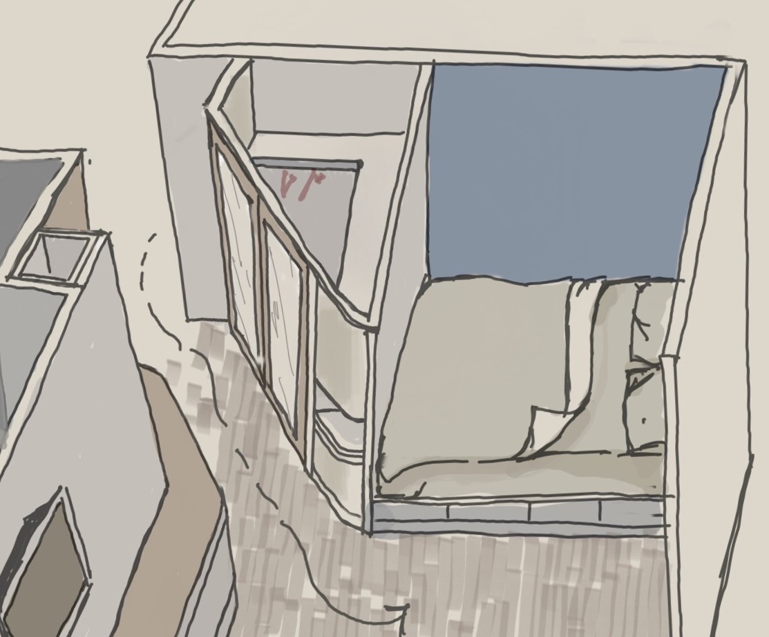 進入主要房間,我們將原先90度的出入動線改為45度。因為動線的調整,自然形成了一個梯形的收納儲藏間,後方也能夠擺放一張雙人床,進門也不會直接看到床,一舉兩得。