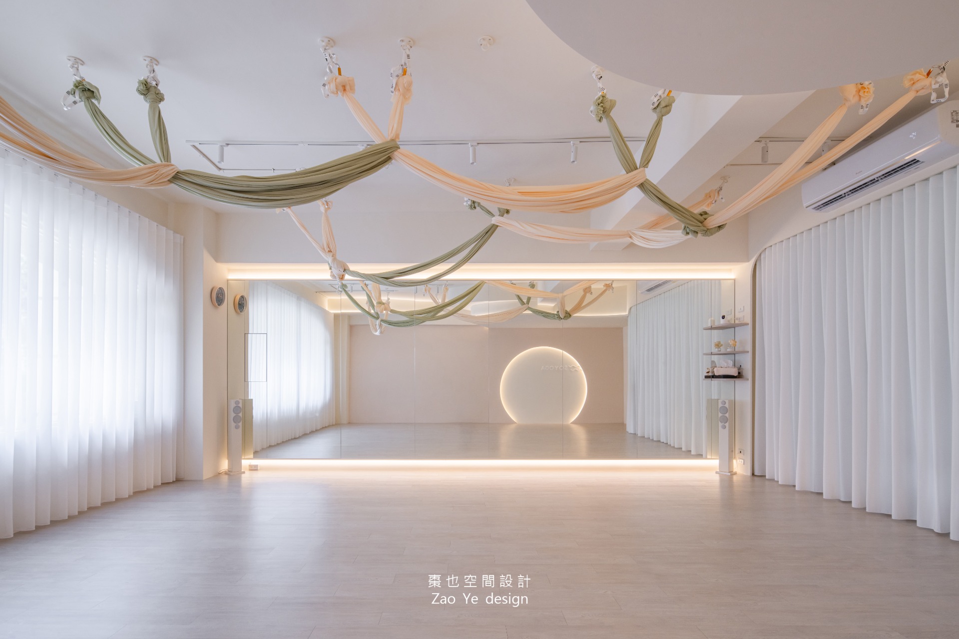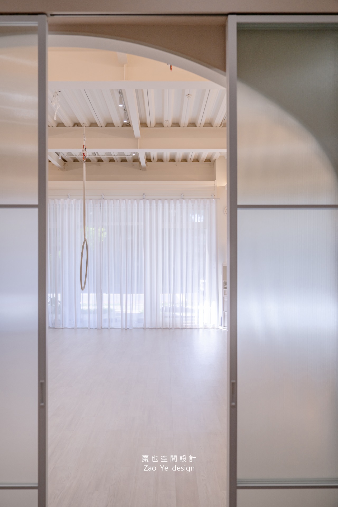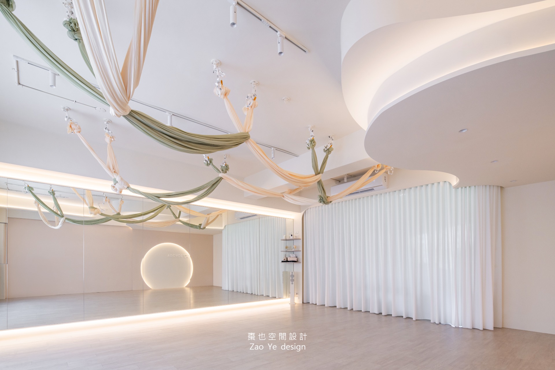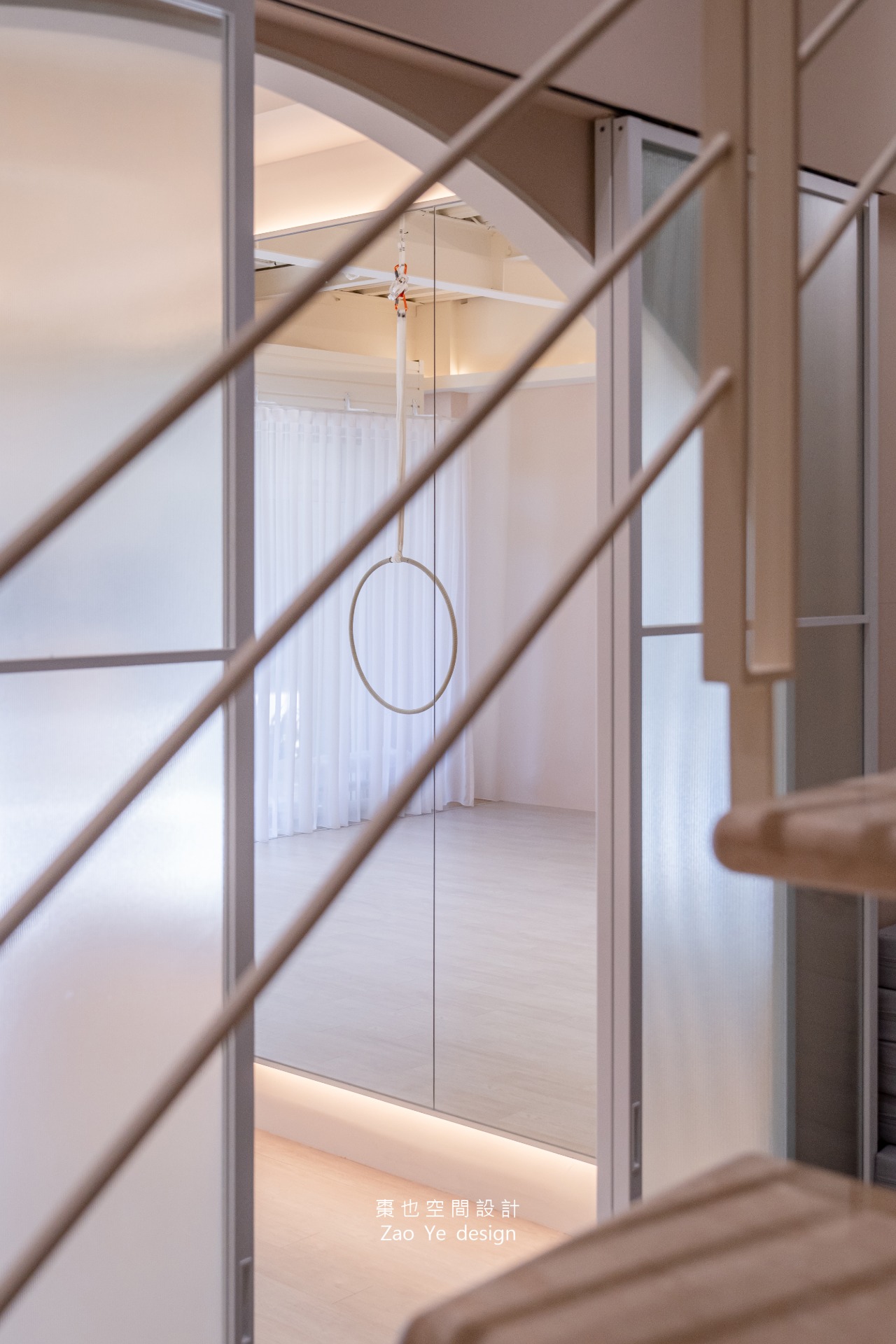 走上二樓,天花板上的大面積排水管線以不規則的弧形設計巧妙包覆,減弱了壓迫感,同時充分考量到上課空間的實際需求。這樣的設計以柔和的方式與空間共舞,為整體環境增添了趣味與流動感,讓每一次的練習都成為一種真正的享受。