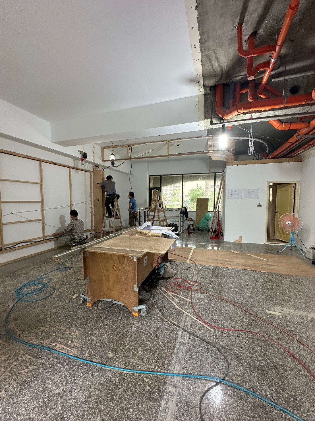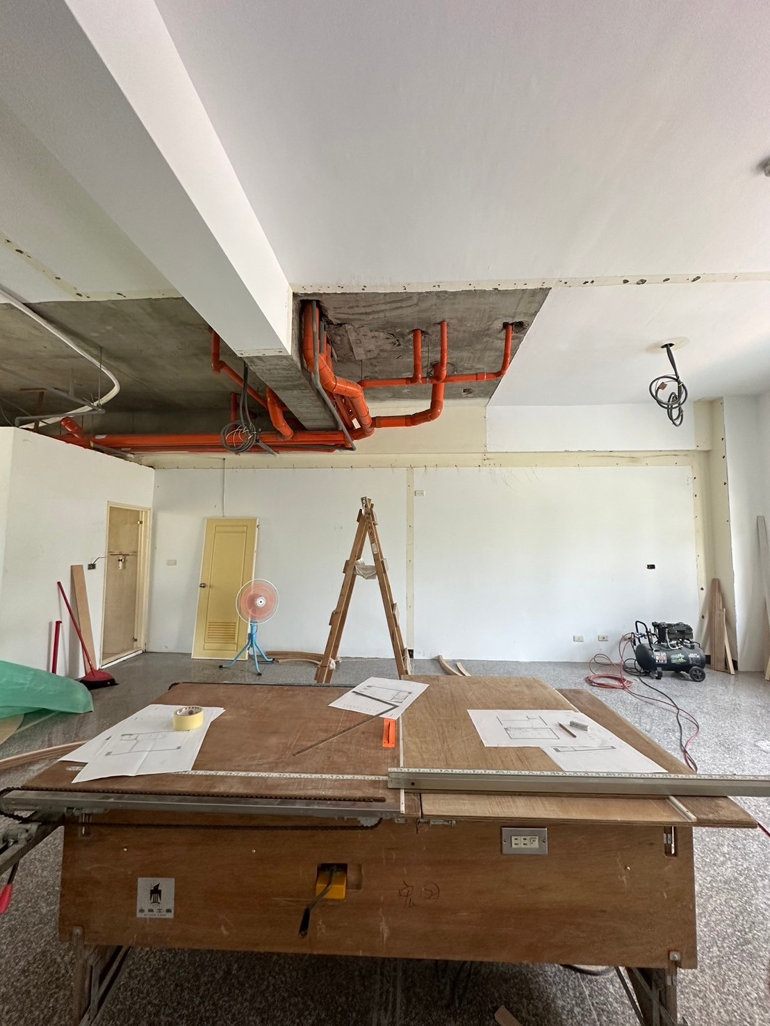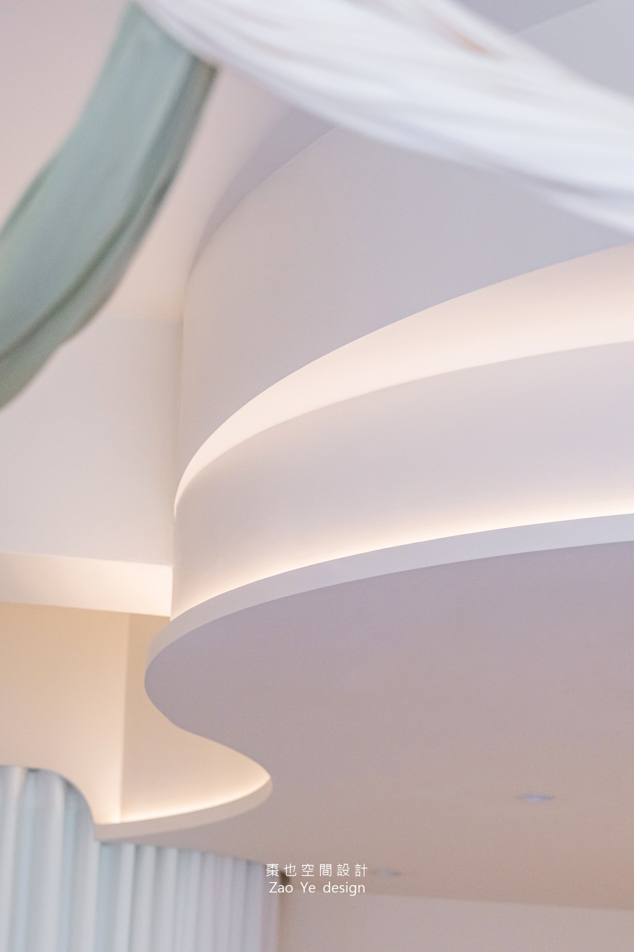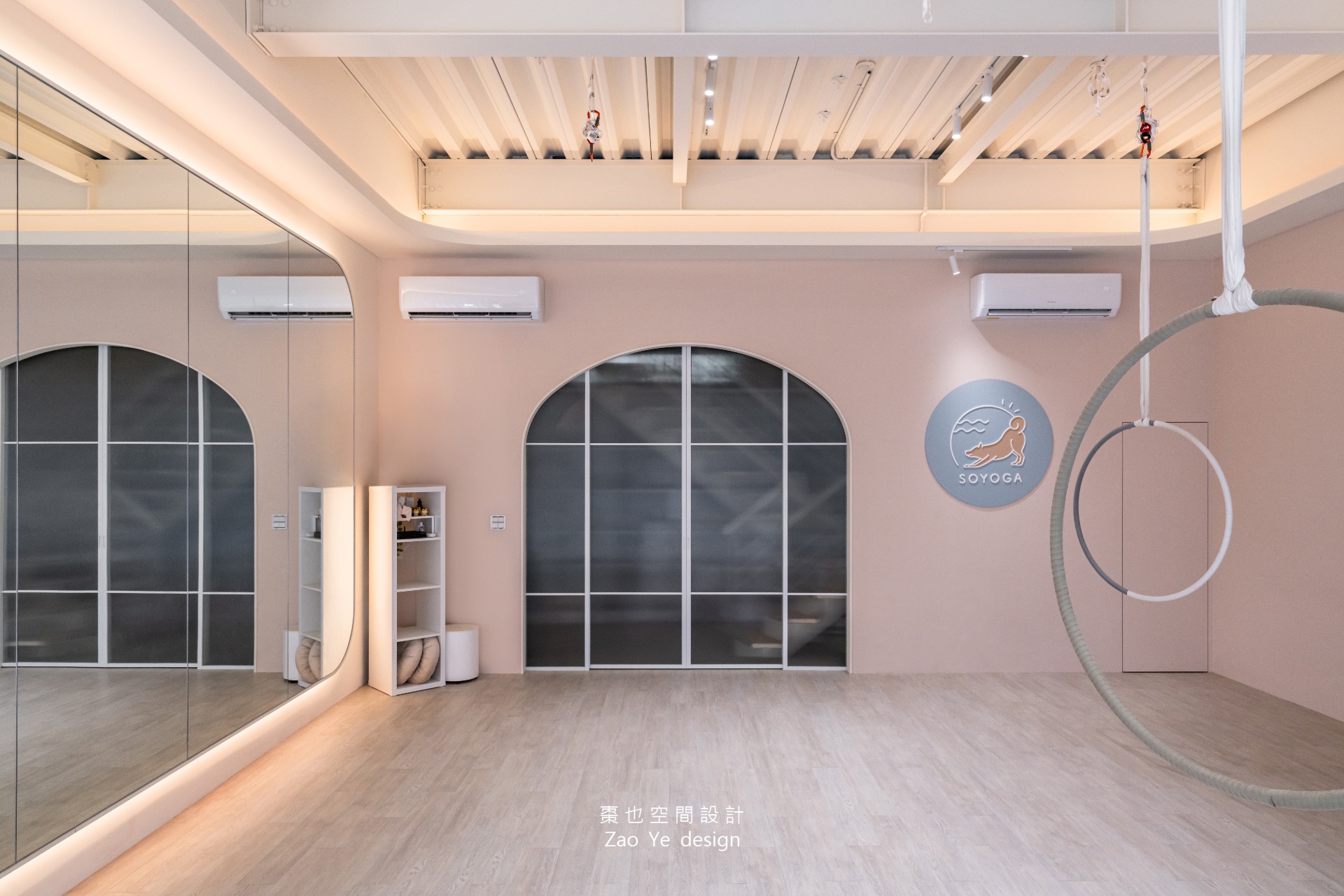 走上二樓,天花板上的大面積排水管線以不規則的弧形設計巧妙包覆,減弱了壓迫感,同時充分考量到上課空間的實際需求。這樣的設計以柔和的方式與空間共舞,為整體環境增添了趣味與流動感,讓每一次的練習都成為一種真正的享受。