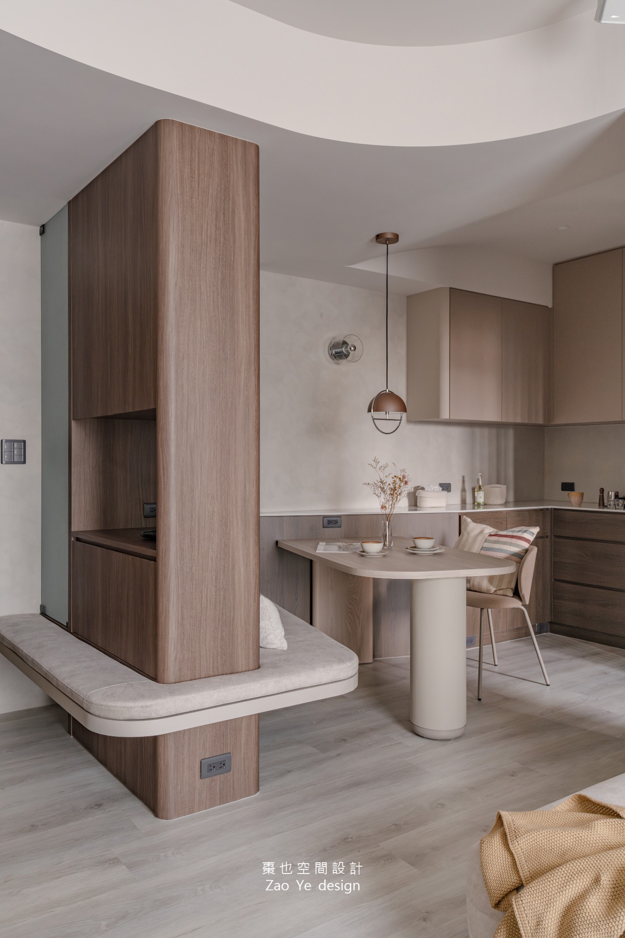 屋主是一名工程師,大半時間忙於工作,下班返家放鬆的時刻總是無比珍貴,圍繞著「在繁忙的生活裡挹注片刻的寧靜」為主題,希望能以不同向度的曲面造型,創造出圓潤、溫暖、沈穩內斂的居住空間。