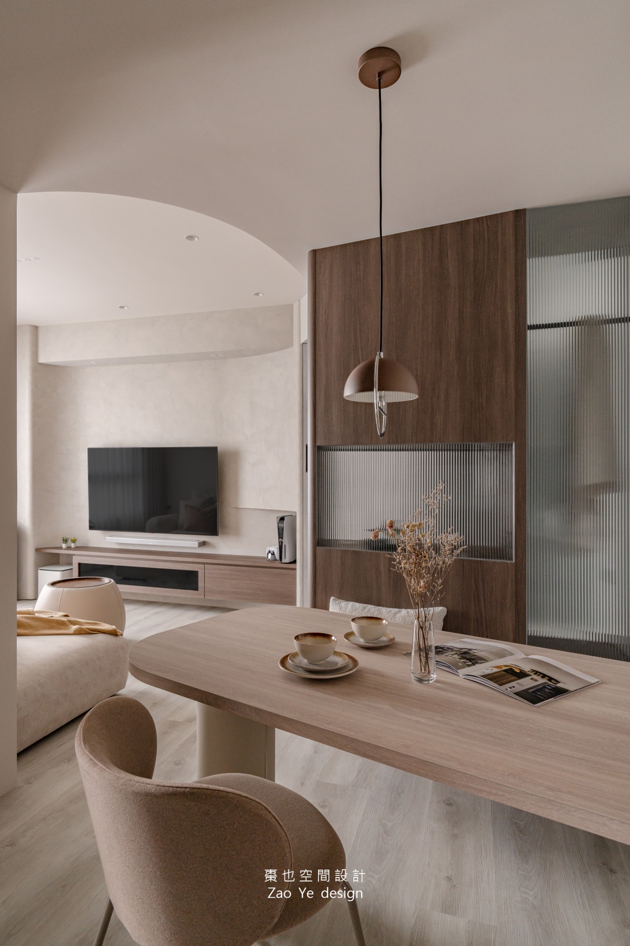 在空間區隔上運用穿透性佳的玻璃,弱化櫃體帶來的壓迫感;在空間中勾勒出自然流暢的曲線,暖灰特殊漆、溫潤的木質與米白色的布料搭配,營造溫潤舒適的氛圍,讓整個屋子更平易近人。