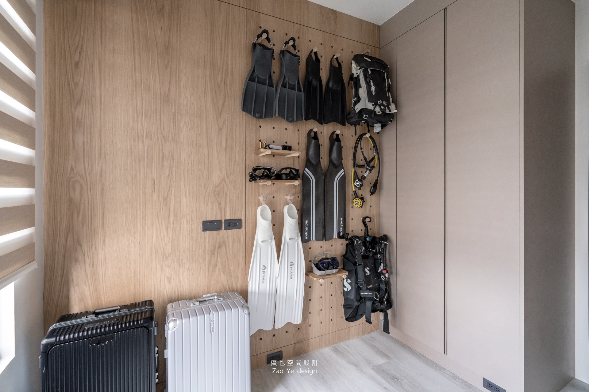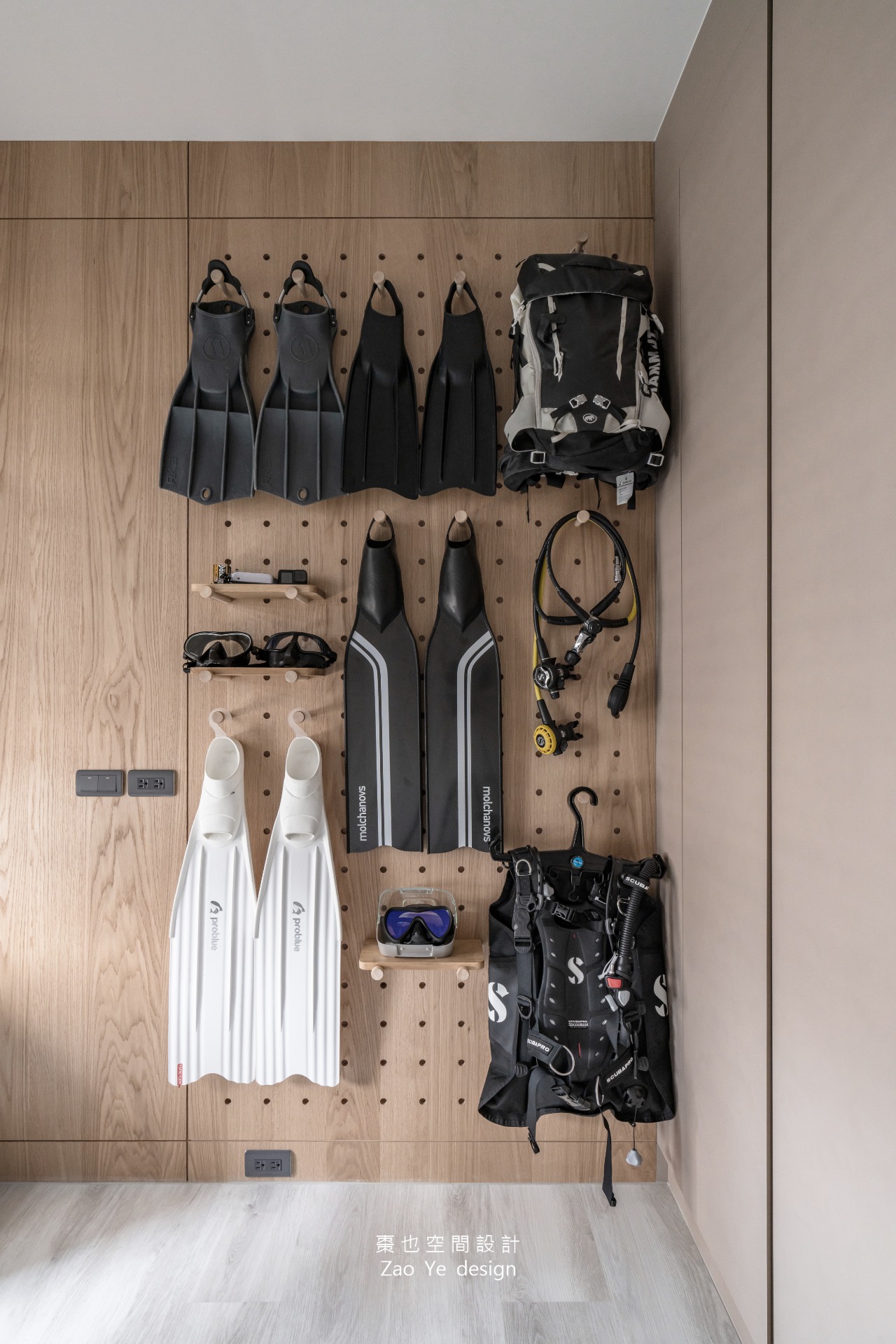 而兩間次臥分別是一個裝備房,同時也是為未來孩子準備的空間。透過洞洞板收納屋主的愛好用具,每一件裝備都是對生活的熱愛的證明。